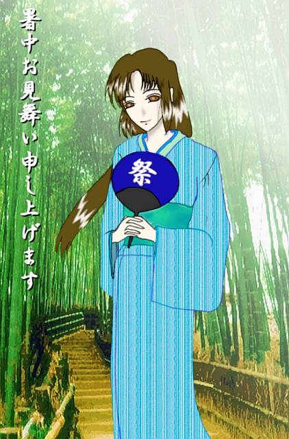 「暑中見舞いということで涼しげな(?)佳代さんを描いてみました。 背景はフリー素材の写真を加工したものを使用させて頂いております。 この絵は線の汚さに耐え切れず、掲載半年後に差し替えたものです」